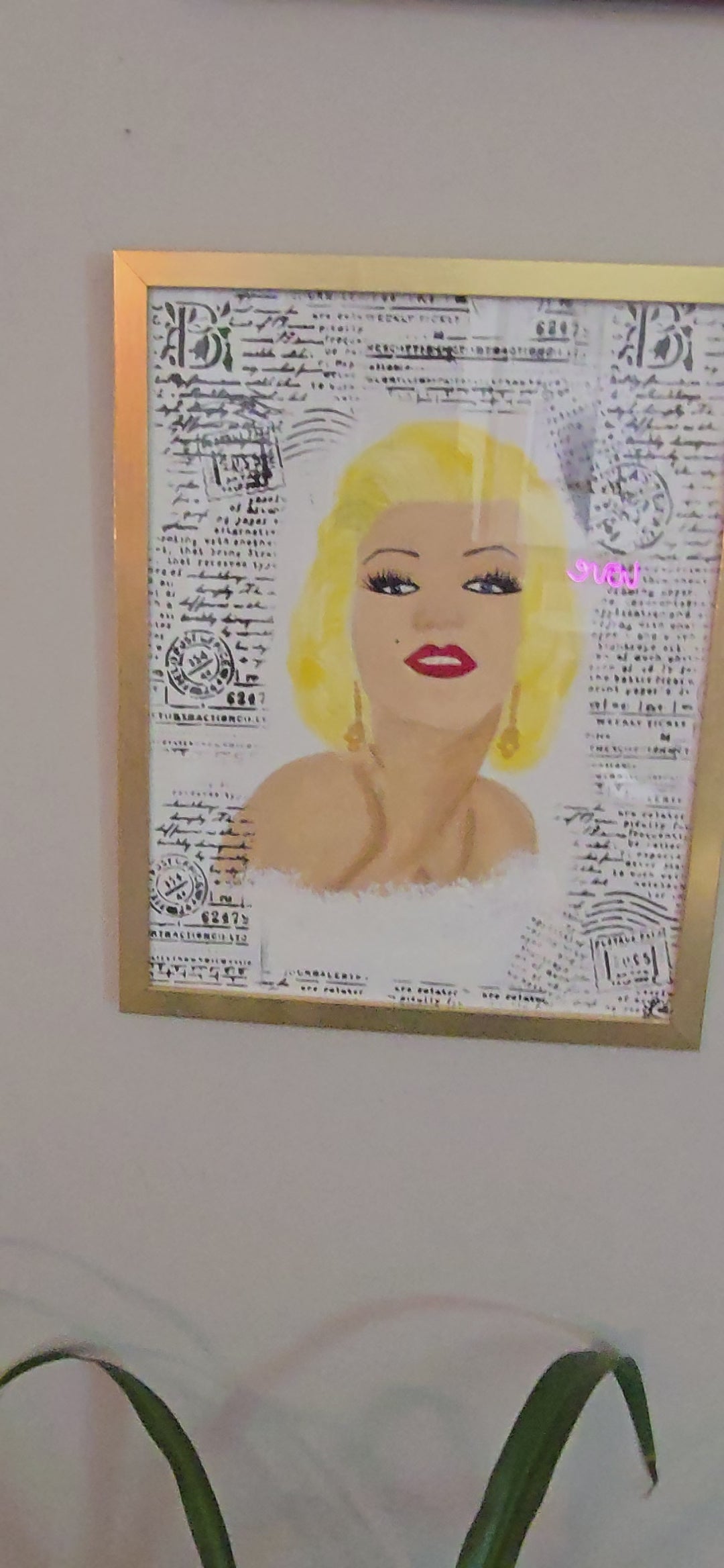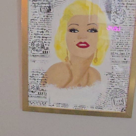 Bring bold beauty and vintage glamour into your space with Glam Gold Lady — an original 11x14 mixed media artwork framed in shimmering gold. This hand-painted portrait features a radiant blonde bombshell set against a collage of vintage-style stamps and handwritten script, evoking the timeless elegance of old Hollywood.