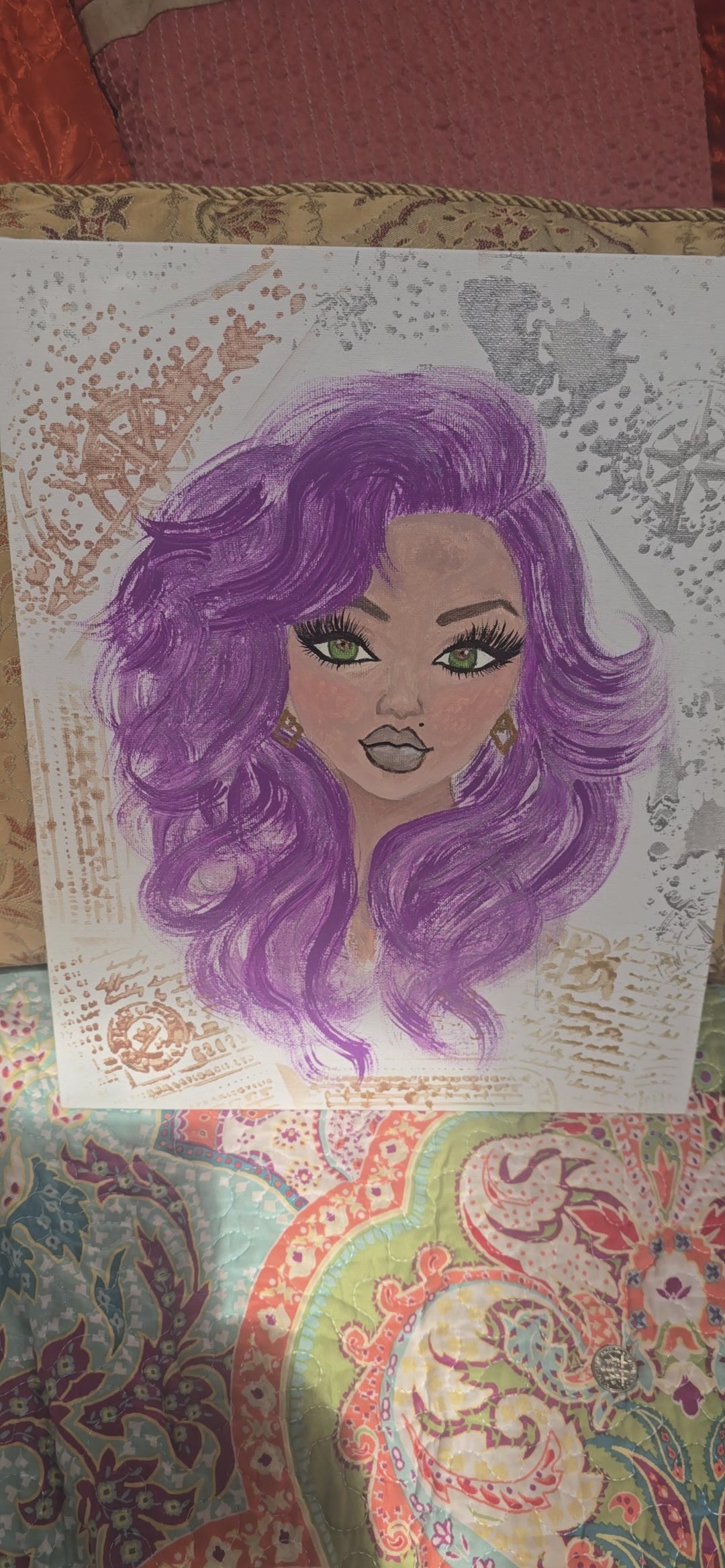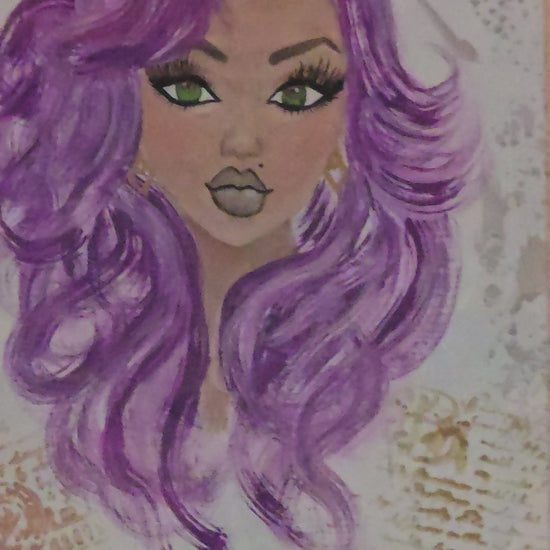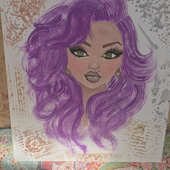 With bold lashes, emerald eyes, and voluminous purple waves, this original piece combines acrylic painting and layered texture stamps to create a dynamic and dimensional background that pops.