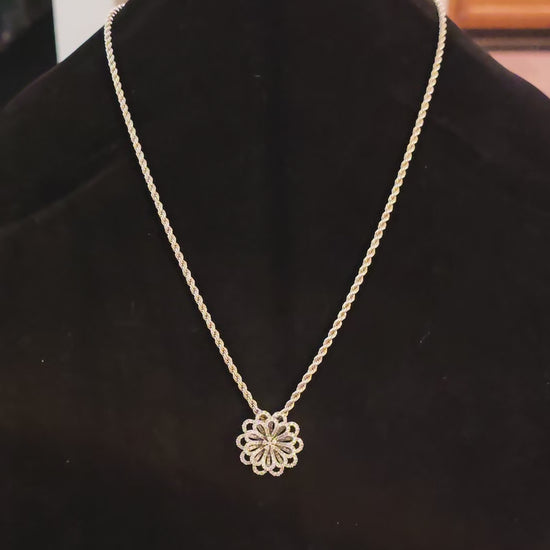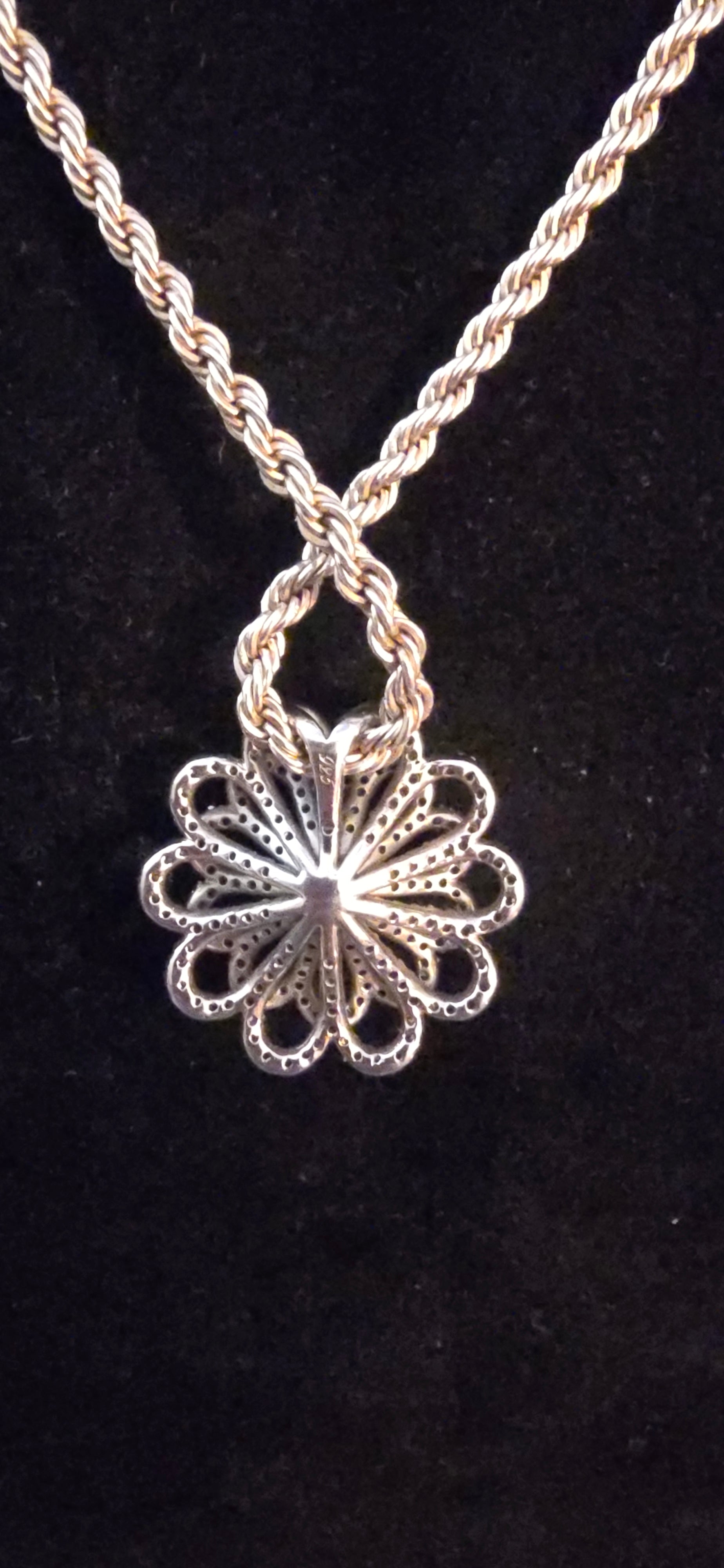Beautiful vintage 925 sterling silver necklace featuring a classic rope chain and an elegant floral pendant accented with sparkling clear stones. Both the chain and pendant are solid sterling silver and stamped 925.