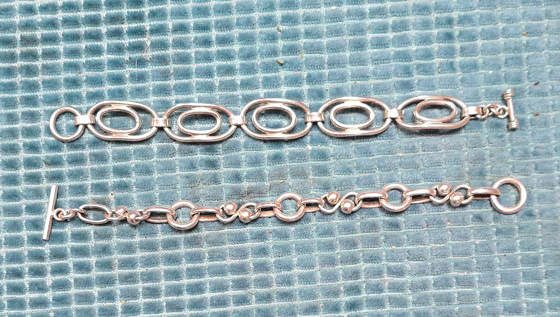 Beautiful vintage sterling silver bracelets with secure toggle clasps. Each has its own unique design — one bold and modern, the other delicate with small bead details. Both are genuine sterling silver, lightly worn, and full of timeless charm.